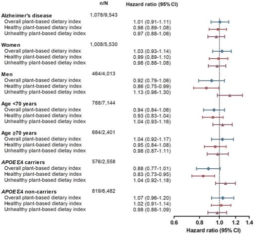 14.5년의 추적관찰 연구를 통해서 총 9,543명의 건강인 중 1,472명이 치매를 발병하였다. 채소기반식이인덱스(PDI)는 결과적으로는 치매 발병과 관련이 없는 것으로 관찰되었다. 하지만 APOE4 캐리어 남성의 경우에는 유의미하게 치매 발병 위험도가 낮아지는 것이 관찰되었다.