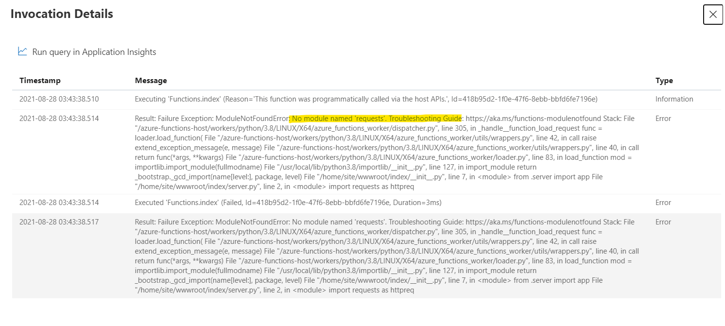 12:49:16 PM <functionname>: [03:49:16+0000] Successfully installed Flask-2.0.1 Jinja2-3.0.1 MarkupSafe-2.0.1 Werkzeug-2.0.1 appdirs-1.4.4 astroid-2.7.2 attrs-21.2.0 azf-wsgi-0.3.1 azure-functions-1.7.2 certifi-2021.5.30 charset-normalizer-2.0.4 click-8.0.1 idna-3.2 iniconfig-1.1.1 isort-5.9.3 itsdangerous-2.0.1 lazy-object-proxy-1.6.0 mccabe-0.6.1 mypy-extensions-0.4.3 packaging-21.0 pathspec-0.9.0