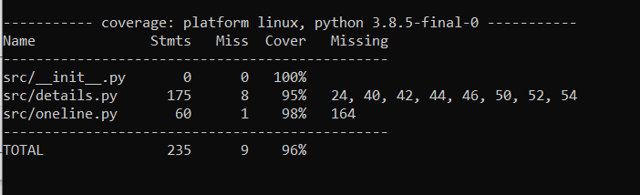 Reporting It is possible to generate any combination of the reports for a single test run. The available reports are terminal (with or without missing line numbers shown), HTML, XML and annotated source code. The terminal report without line numbers (defau